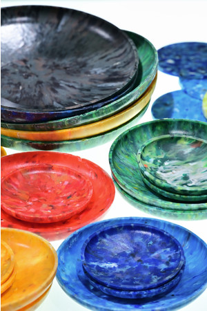 海洋プラスチックごみをアップサイクルしたインテリアトレー。廃棄されるものから工芸品を作ることで、長く大切にされる製品へ生まれ変わらせるという思いで作られています。各地のビーチクリーンで採取されるプラスチックごみが材料となっており、同じ色味のものは二度と作れない、世界で一つだけのとっておきのインテリアです。