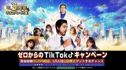 TikTok上では,賞金総額50万円相当とLR人材“山田孝之”を入手チャンスがあるキャンペーンを実施中。
