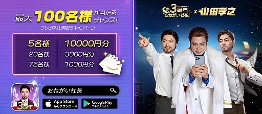 IYAGAMESが贈る、会社経営シミュレーションスマホゲーム『おねがい社長』が遂にリリースから3周年を迎え、山田孝之さんと史上最大のコラボ&初のTVCM放送が決定!