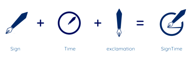 社名の「サインタイム(SignTime)」からペンと時計を連想させ、シンボルマークのモチーフに採用。電子契約サービスであることが直観的に伝わるデザインに仕上げました。ペンは向きを変えると、「!」のマークになり、サインタイムがこれから展開するサービスで世界を驚かせる様子を表現しています。