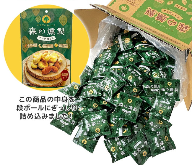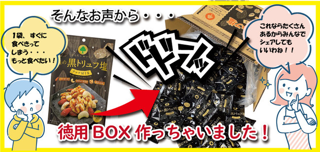大人のプレミアムなナッツとして人気の「森の黒トリュフ塩ナッツミックス」と「森の燻製ナッツミックス」、 「海薫るうにナッツミックス」は、食べきりサイズの個包装タイプで持運びにも便利な人気の商品です。高級素材を組み合わせたナッツは、こだわり志向のお客様に人気のシリーズで、大容量サイズを求めるお声をいただくことが多く、この度、遊び心あふれる、段ボール “1箱丸ごと” 商品としてお得なBIGサイズの商品に仕上げました。お客様のお声から生まれた、大人数でも十分にシェアできる大満足のサイズの商品です。