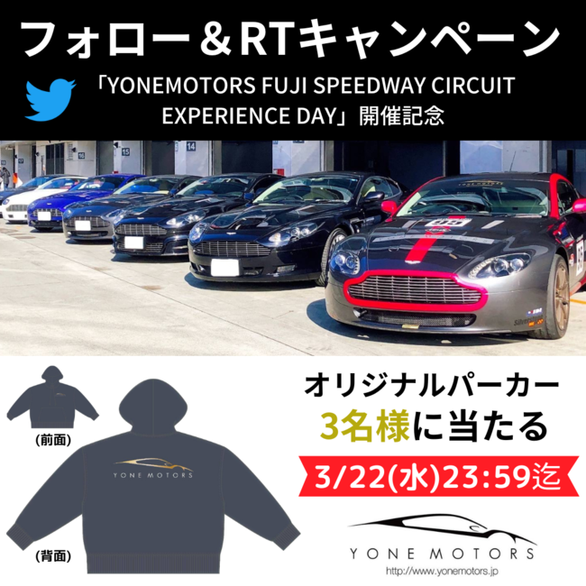 愛車でレーシングコースを走行できる「YONEMOTORS FUJI SPEEDWAY CIRCUIT EXPERIENCE DAY」の開催を記念して、YONEMOTORS公式Twitterでフォロー&RTキャンペーンを実施します。抽選で3名様にYONEMOTORSオリジナルパーカーが当たります。