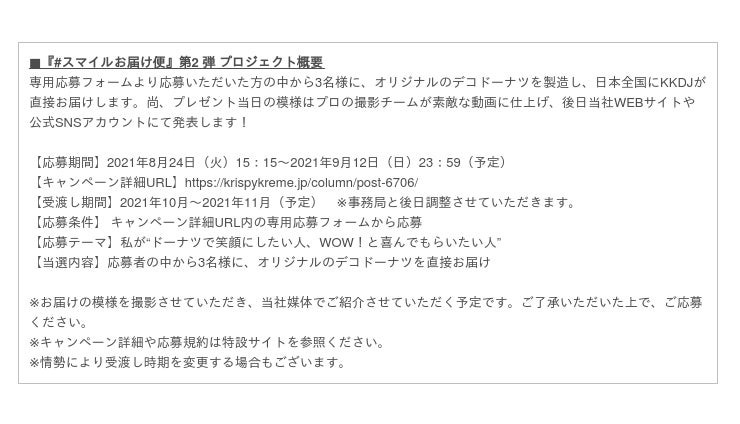 ご好評いただいた第1弾に続き、お客様とお客様の大切な人にもドーナツで“WOW!”と喜んでいただける時間を『#スマイルお届け便』第2弾でお届けします。普段なかなか伝えられない感謝の気持ちを伝えたい、ドーナツを使ったサプライズで特別な瞬間をお祝いしたい、そんな大切な人への想いを大募集。ご応募いただいた方の中から3名様に、あなただけのオリジナルデコドーナツを作成し、KKDJが日本全国へ直接お届けします。尚、今回もプレゼント当日の模様をプロの撮影チームが素敵な動画に仕上げ、後日当社HPや公式SNSアカウントにて発表します。