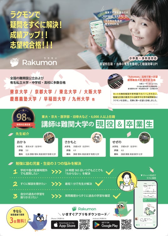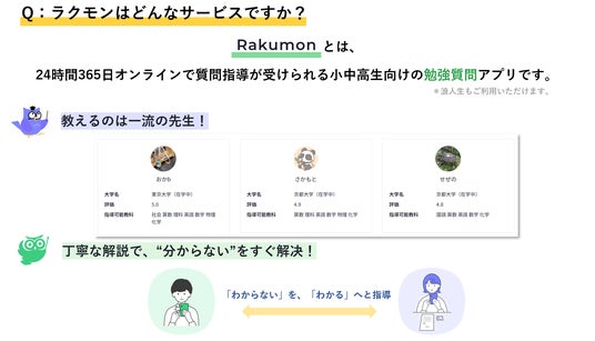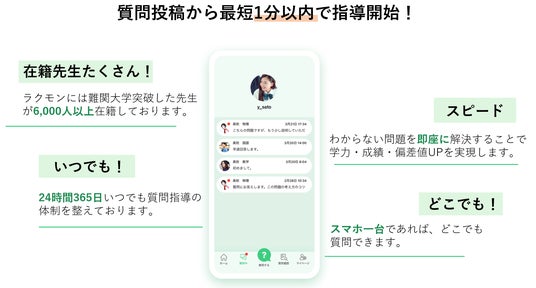 ラクモンは24時間365日オンラインで質問指導が受けられる小中高生向けの勉強質問アプリです。