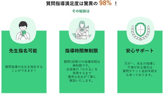 - 質問1投稿での指導時間は無制限です。生徒様の「わかる」を実現するまで優秀な先生が丁寧に解説いたします。