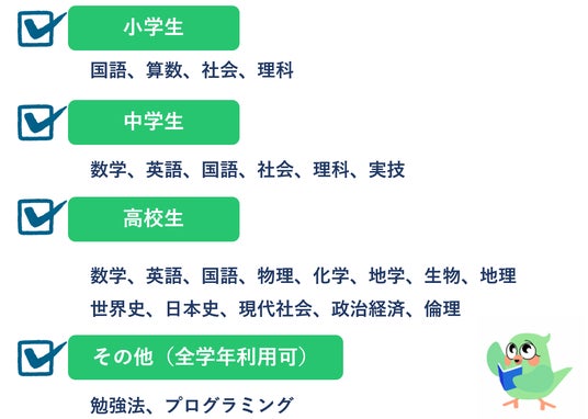 【対応科目一覧】小学生:国語、算数、社会、理科、中学生:数学、英語、国語、社会、理科、実技、高校生:数学、英語、国語、物理、化学、地学、生物、地理、世界史、日本史、現代社会、政治経済、倫理、その他(全学年利用可):勉強法、プログラミング