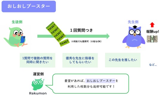 - 『おしおしブースター』の利用枚数が増えるごとに先生の報酬がUPするため、「1つの質問投稿で複数の質問を同時に聞きたい」「優秀な先生に指導をしてもらいたい」などのシチュエーションでの利用をおすすめします
