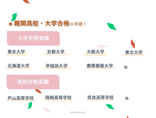その他にも地方国公立大学やMARCH、関関同立だけでなく戸山高校、岡崎高校などの偏差値70を超える難関高校の合格実績もございます。