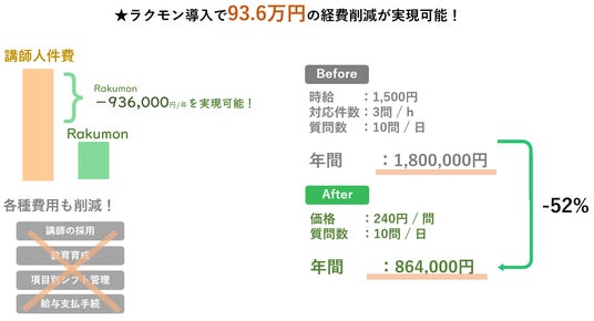 塾の営業日数360日、アルバイトの時給1,500円、1日あたりの生徒様からの質問数が10問、1問あたりの解説時間を20分と仮定した場合、ラクモン導入で93.6万円(52%)の費用のコストカットが可能です。