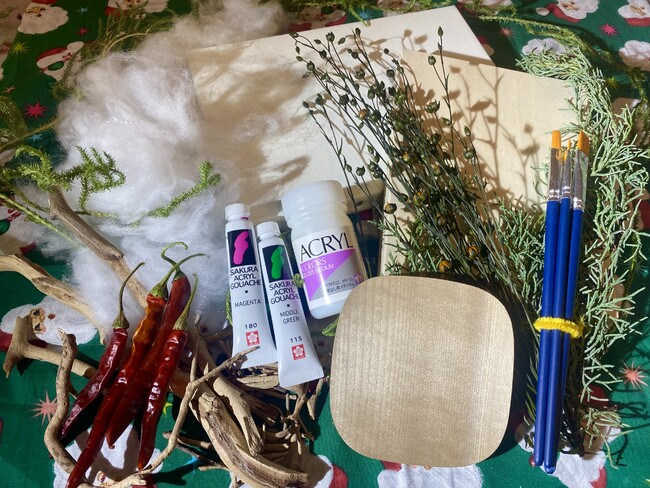 絵の具や筆、メディウム、ラメ、ドライフラワー等と詰め合わせて送ります。絵の具でペイントするだけではなく、パーツをコラージュ(貼り付け)する体験もできます。