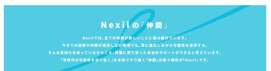 株式会社Nexil(ネクシル)は『次世代の可能性を切り拓く』という経営理念の元、20代に特化した転職サポート事業やエンジニア育成事業などを展開する急成長中のベンチャー企業です。