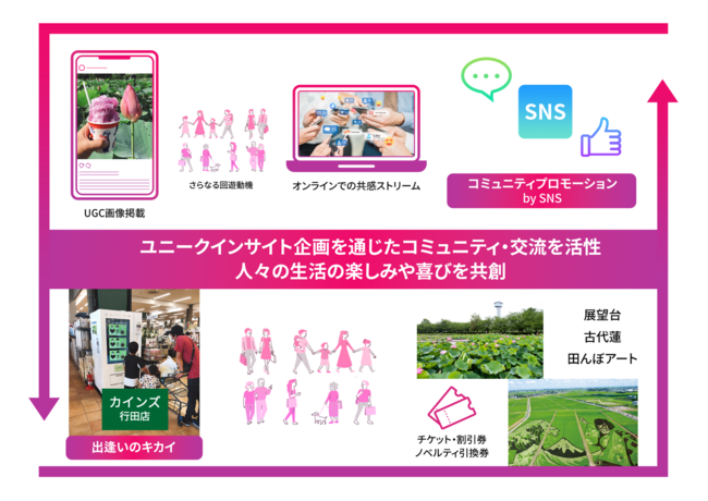 「出逢いのキカイ」から、オフライン・オンラインのキャンペーンを通じてマーケティング活用することで、顧客が初めて情報・商品やサービスと出逢い、コミュニティに参画し、交流と共創のきっかけを創ることができます。この度はカインズ行田店・行田市との地域共創を実現するべく、公民を超えたクロスボーダーな三者協力のもとで、エムエスディのコミュニティ活性企画のコミュニケーションメディア装置として、カエルサイネージをハブとして、コミュニケーションの活性と共創を実現いたします。同時にオンライン上でのSNSキャンペーン企画との連動を通じて、オンオフ両面でのコミュニティ活性を実現します。