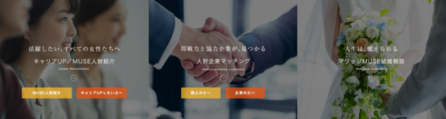 個人と企業へ向けた人財企業マッチング、活躍したいすべての女性に向けた企業マッチングやキャリアアップMUSE講座、結婚のその先もサポートするマリッジMUSE結婚相談など、人と人、人と会社、会社と会社をあらゆる専門家の豊富な知識と経験をもとにしっかりとサポートしていきます。グループ会社では経営コンサルティング事業、不動産事業、金融業、産前産後ケア事業、訪問看護事業を展開しており、これらのグループ会社とリンクしてトータルサポートできるのが特徴です。