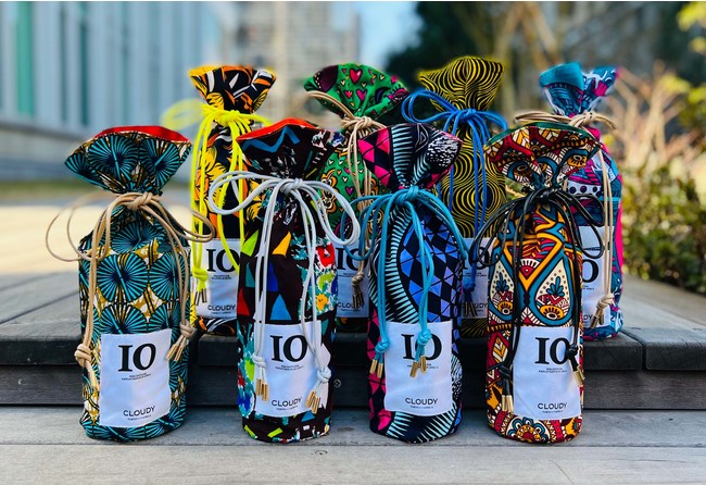 パッケージには色鮮やかな伝統のアフリカンファブリック”キテンゲ"を用いた巾着を8種類ご用意しました。リサイクル素材でできたブランドネームタグに大きく記載された「10」は、CLOUDYでこのボトルをご購入いただくことで売上の10%が認定特定非営利活動法人Doooooooo(ドゥ)を通じてアフリカの女性や障害者の雇用支援の活動費用となることを表現しています。