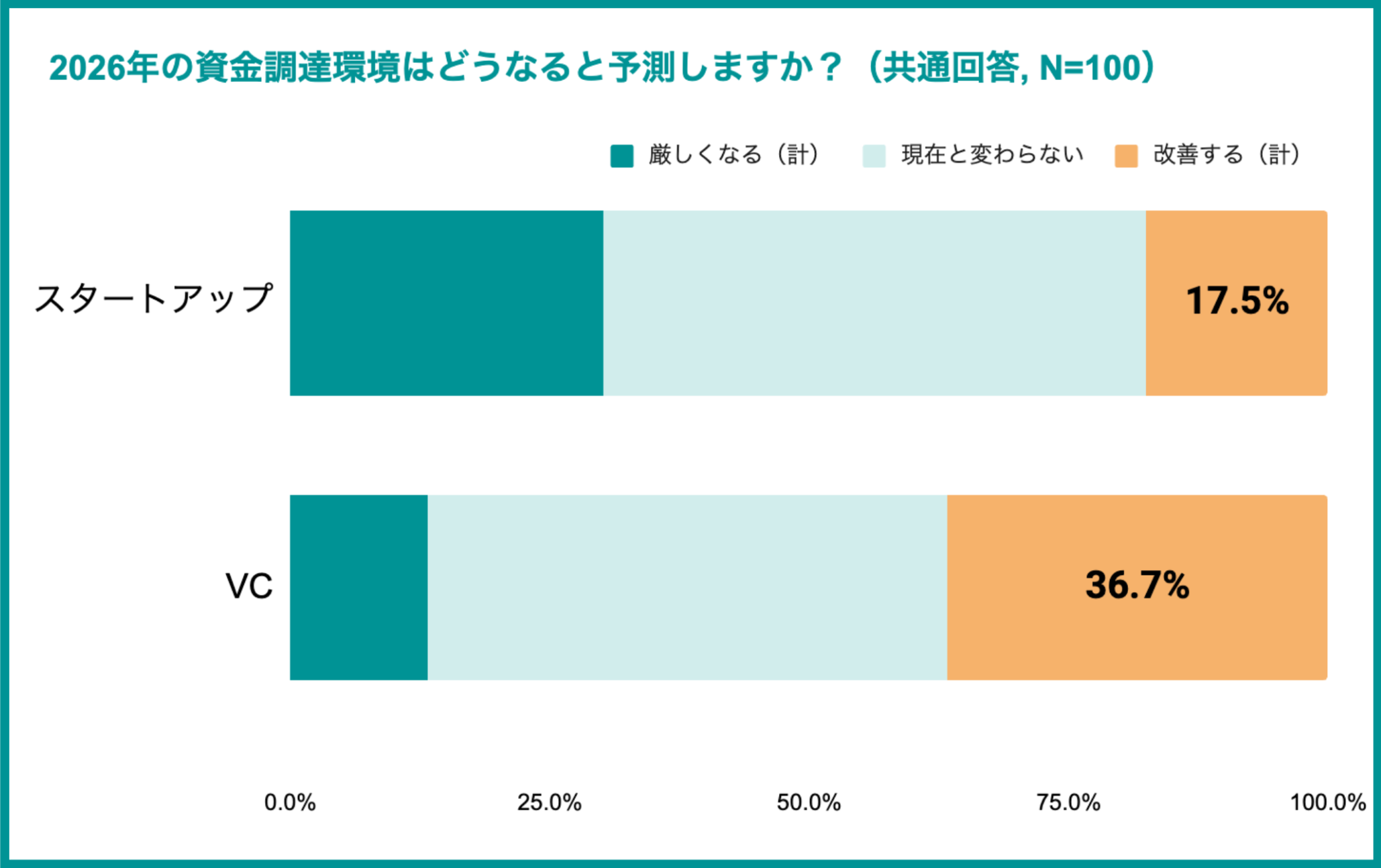 改善を期待するVCに対し、慎重なスタートアップ 2026年の見通しについて、両者の認識には約2倍の開きが生じています。VCの36.7%が「改善する」と予測する一方、スタートアップでは17.5%に留まりました。 VC側は潤沢な待機資金を背景に楽観視していますが、企業側は市場の二極化が進む中で選別されることへの強い危機感を抱いていることが推測されます。