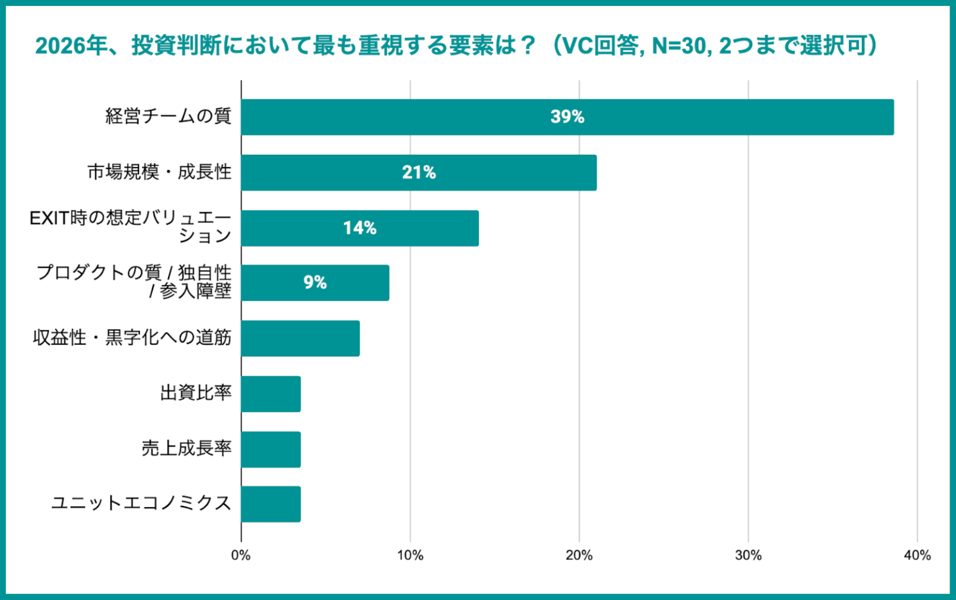 2026年に優先すべき経営資源として、スタートアップの36%が「プロダクト開発」を挙げた一方で、VC側が投資判断で最も重視するのは「経営チームの質(39%)」となりました。不透明な市況下では、事業を確実に進捗させる経営陣の適応能力(レジリエンス)がより厳密に問われています。