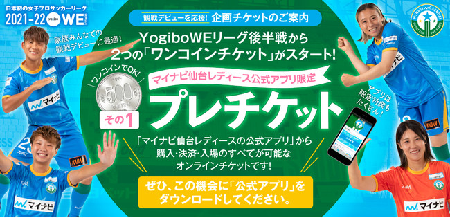 マイナビ仙台レディースの公式アプリから購入・決済・入場のすべてが可能!ワンコイン(500円)でお得に試合観戦をお楽しみください。お子様から大人まで一律500円ですので、ぜひ初観戦のきっかけにアプリダウンロードとプレチケットのご購入を!