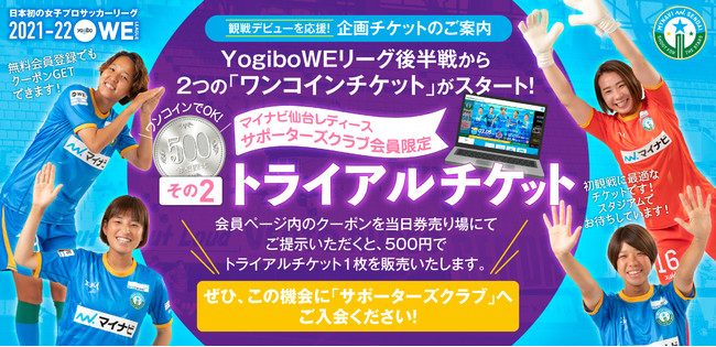 マイナビ仙台レディースサポーターズクラブ会員様(無料会員様含む)を対象にお得なワンコインチケット「トライアルチケット」を販売いたします。サポーターズクラブ会員限定の特典なども随時配信をしておりますので、ぜひこの機会にご入会ください。
