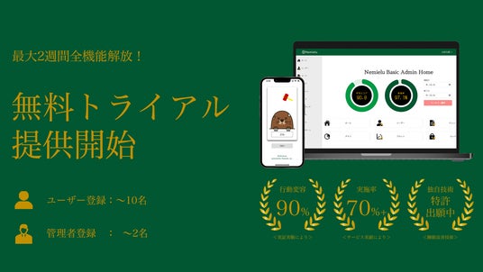 株式会社ネミエル(本社:東京都新宿区、代表取締役:松本 光浩)は、「睡眠を測らない、新しい睡眠施策」が可能になるスリープテックサービス「Nemielu」をより手軽に体験していただける無料トライアル期間の提供を開始しました。 サービス検討中の企業担当者様から多く寄せられた「実際に使ってみたい」という声に応え、導入前の具体的な利用イメージを深めていただけます。2週間のトライアル期間中、最大10名で管理者機能やユーザー体験をじっくりお試し可能。アカウントはサイトのフォームから簡単に発行でき、自動で有料プランに移行することはないため、安心してNemieluの全貌をご確認いただけます。