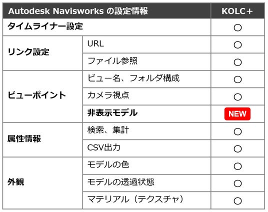 Autodesk Navisworks の設定情報とKOLC+での対応状況