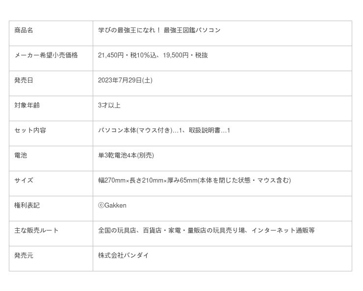 株式会社バンダイ トイディビジョンは、累計発行部数350万部(2023年5月時点)を超える大人気児童書『最強王図鑑』(発行:株式会社 Gakken)のキッズパソコントイ「学びの最強王になれ! 最強王図鑑パソコン」(21,450円・税10%込、19,500円・税抜)を2023年7月29日(土)に発売します。