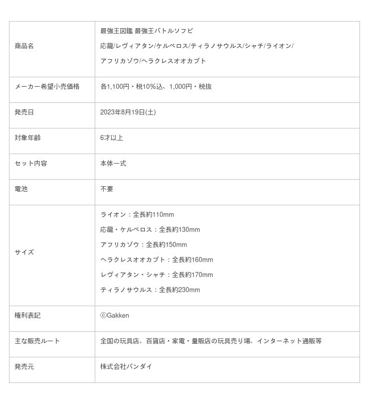 2023年8月19日(土)に新たに発売となる「最強王バトルソフビ」シリーズは、『最強王図鑑』に登場する人気の生物を立体化したソフビシリーズです。ラインアップは全8種類で、シリーズでも人気の「応龍」「ケルベロス」などの強者たちをラインアップしています。
