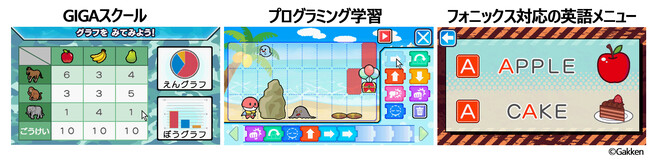 ゲーム感覚で学ぶことができるプログラミング学習メニューは、難易度別で3つのアプリを収録し、手厚いチュートリアルで3才から楽しく簡単に実践することができます。