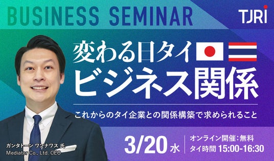 日本とタイをつなぐBtoBマッチングプラットフォーム「TJRI」を運営するMediator Co., Ltd.(本社:タイ王国バンコク、代表取締役社長:ガンタトーン・ワンナワス)は、3月20日(水)日本時間17:00よりオンライン(Zoom)にて「変わる日タイビジネス関係~これからのタイ企業との関係構築で求められること」セミナーを開催します。