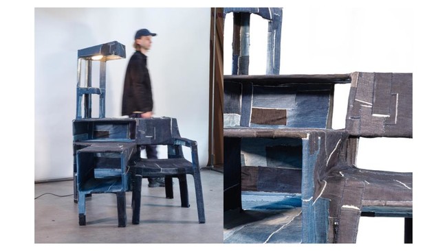 最初に参加したデザイナーは、テウン・ズヴェッツです(Teun Zwets : 1992年生まれ)。彼は2020年にデザインアカデミー・アイントホーフェンを卒業後、カザーネ賞を受賞。驚くべきは、その創作着手の速さです。まずは動き出すことをモットーに、今回『The Art of RAW』とともに彼が制作したオブジェは『Denim Living』。 椅子のプロトタイプから始まり、ベースとなる金属のフレームを作り、そして強度を増すためにデニムの屑を一枚一枚重ね合わせ、最終的にはバインダーで生地を張り合わせ、強固なものにしました。完成した家具は、ランプ、食器棚、椅子が一体となった、ユニークなアートピースとなりました。