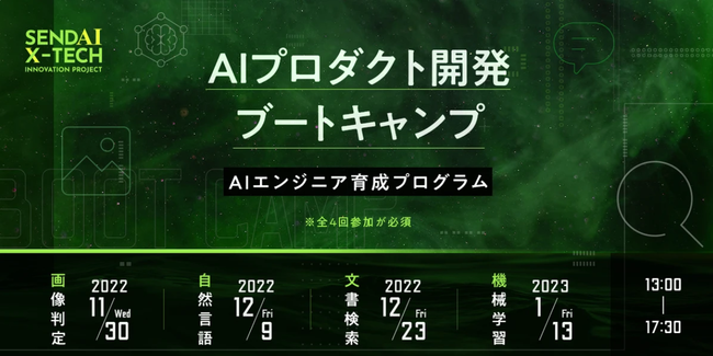 仙台市は、AI関連ビジネスが持続的に生まれるエコシステム「AI-Ready都市・仙台」を目指す取り組み「仙台 X-TECHイノベーションプロジェクト2022-2023」(企画運営:仙台 X-TECH 推進事務局、事務局長:竹川隆司、特設サイト:https://lp.techplay.jp/sendaixtech/)の一環として、仙台市において、AIエンジニアとして活躍できる人材を育成する「AIエンジニア育成プログラム AIプロダクト開発ブートキャンプ」(以下、「本講座」)を開催することをお知らせいたします。