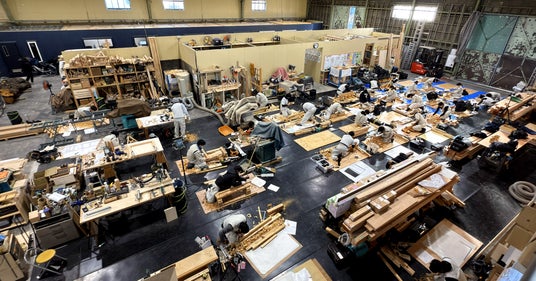 前回の様子。広い加工場に大工たちが一堂に会する。