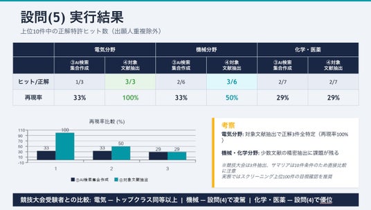 「AI検索集合作成」により生成された検索集合の上位10件では、すべての技術分野で正解特許を1件以上特定できていることが確認されました。