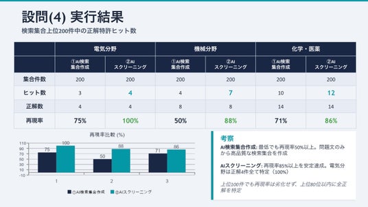 「スクリーニングツール」により抽出された関連度スコア上位200件では、再現率85%以上という非常に高い結果が得られました。特に【電気分野】では、正解特許4件すべてを特定しており、モレの少ない検索・選別が実現できていることが確認されました。