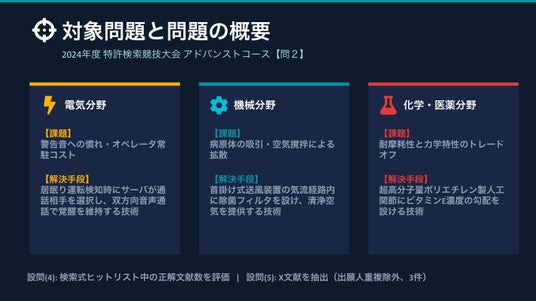 今回の検証では、2024年度 特許検索競技大会 アドバンストコースのうち、「問2_設問(4)・設問(5)」を対象として調査を行いました。