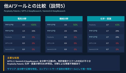 なお、サマリアの「調査支援ツール」はコンプリートサーチを目的とするものであるのに対し、GPT5.2 DeepResearch, Gemini3.0 DeepResearchは特許調査を目的とするものではなく、また、Perplexity Patentsもコンプリートサーチを目的とするものではないため、ツールの目的が相違する点を考慮する必要があります。