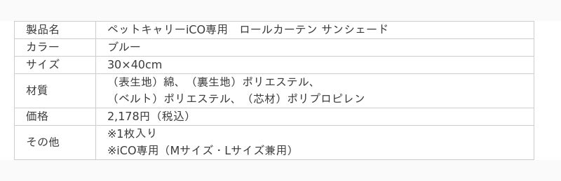 今回新たに発売する『ロールカーテン サンシェード』は、慣れない場所や人が多い場所などへのお出かけ時に、ペットを安心させるために利用したり、夏の暑い日差しからペットを守るための製品です。iCOのメッシュ扉部分に簡単に装着でき、目隠しや日差しカットの役割を果たします。使わないときは、装着したままクルクル巻いて収納できるので、手荷物を増やす心配もありません。白地にブルーのペチコオリジナルデザイン柄で、サイズはiCOのMサイズ・Lサイズ兼用のワンサイズ。価格は1枚、2,178円(税込)です。