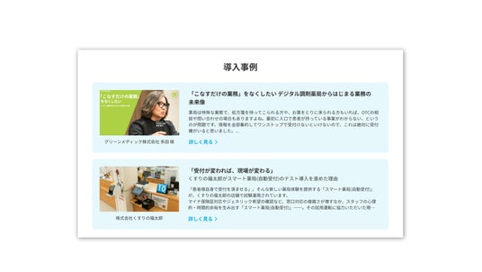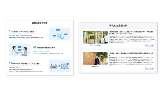 初めて薬師丸賢太を知る方にも信頼を得られるよう薬局の課題と導入効果を明確にし、実際に導入いただいている企業の声を強調しました。