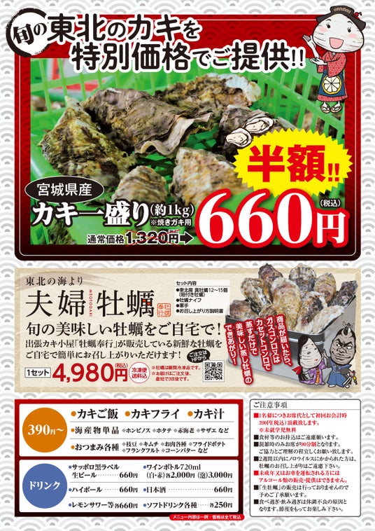 牡蠣は「石巻産殻付き真牡蠣」(約1キロ=殻付き4~6個)通常1,320円を東北復興支援価格として1盛り660円で提供するほか、「北海道産牡蠣」(約3個~5個)「瀬戸内産牡蠣」(約7~12個)(以上通常1,320円を1,200円で販売)を用意。