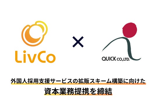 株式会社LivCo(以下LivCo)と株式会社クイック(以下クイック、東証プライム:3854)はこの度資本業務提携を締結いたしました。本提携により、両社は外国人採用支援サービス分野で協業し、業界に先駆け拡販スキームの構築を相互に目指してまいります。LivCoの持つ外国人材支援のノウハウと、クイックが1980年の創業以来総合人材サービス企業として多岐にわたるサービス・多数のお客様へのご支援を行ってきた実績を融合させ、新たな協業モデルの創出を図ります。