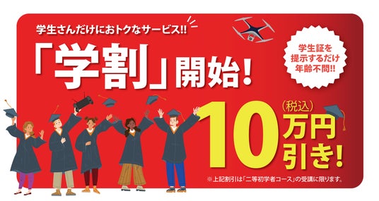 株式会社IWAMOTO(本社:和歌山県和歌山市、代表取締役:岩本勉、以下「IWAMOTO」)は、2024年7月19日(金)より、ドローン国家資格の取得を目指す学生を応援すべく、2024年7月19日(金)~2024年8月31日(土)の期間限定でドローンスクールがお得に受講できる学割キャンペーンを実施します。就職にも役立つ可能性がある国家資格をぜひこの機会に取得してみましょう!