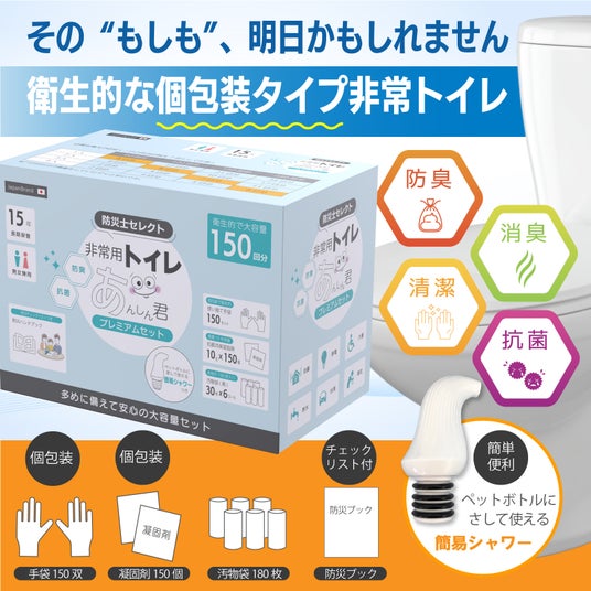 「あんしん君」シリーズに非常用トイレ150回分セットが新登場。個包装と簡易シャワーで衛生面も安心。