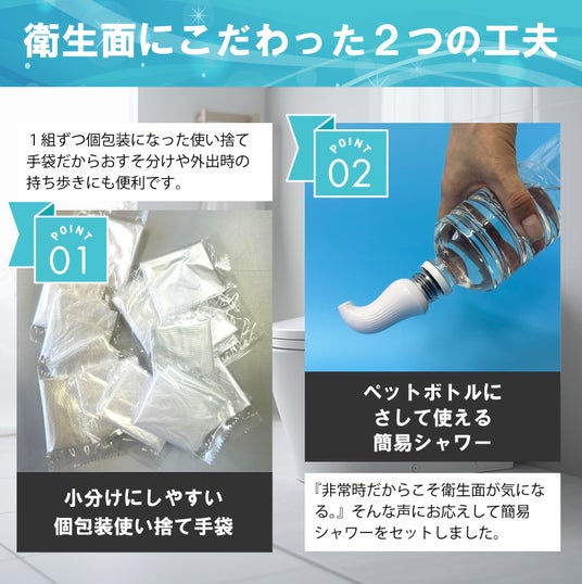 非常時こそ、衛生的に過ごしたいもの。本製品には、ペットボトルに取り付けて使える簡易シャワーをセットに含めました。水道が使えない状況でも、清拭などに使えるため、清潔を保ちながら、心のゆとりにもつながります。