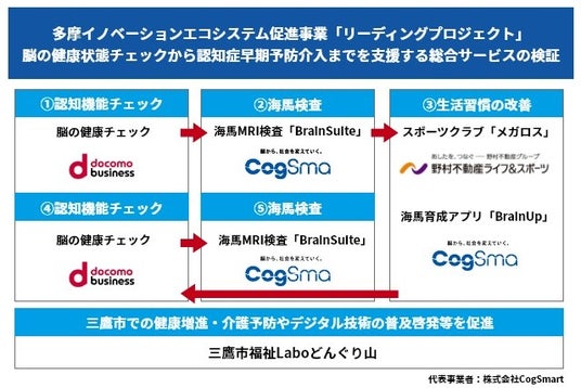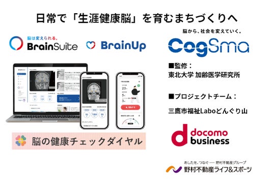 このたび、この「BrainUp(R)(ブレインアップ)」を用いた「脳の健康状態チェックから認知症早期予防介入までを支援する総合サービスの検証」(実証事業)を、株式会社CogSmartを代表事業者として、三鷹市福祉Laboどんぐり山[※3]、NTTコミュニケーションズ株式会社、野村不動産ライフ&スポーツ株式会社[※4]と共に開始します。
