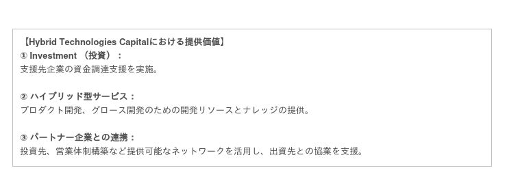 「Hybrid Technologies Capital」は、多くのスタートアップ企業にて挙げられる資金調達の難航や社内リソースの枯渇という課題を解決し、スタートアップ企業の事業成長を目的として立ち上がった投資プロジェクトです。当社の強みであるべトナムと日本のエンジニアリソースを融合させたハイブリッド開発のリソース提供と資金の提供を行うことで、支援先企業のDX支援と事業拡大を目指します。