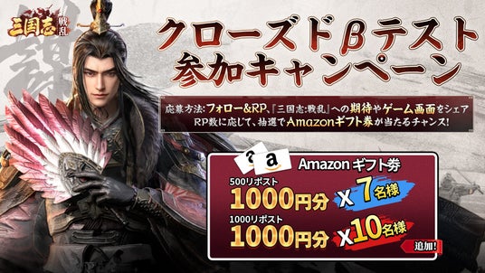 クローズドβテスト(CBT)の開催を記念して、公式X(@sangokusenran)にて参加キャンペーンを実施中!対象ポストをフォロー&リポストの上、『三国志:戦乱』への期待コメントやプレイ画像を投稿することで応募完了。抽選でAmazonギフト券が当たるチャンスもお見逃しなく。