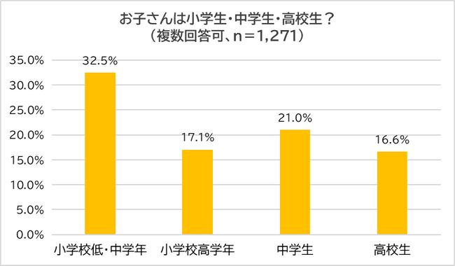 「子供は小学生?中学生?高校生か?」を尋ねたところ、「小学校低・中学年」(32.5%)が最も多く、「中学年」(21.0%)、「小学校高学年」(17.1%)、「高校生」(16.6%)となりました。