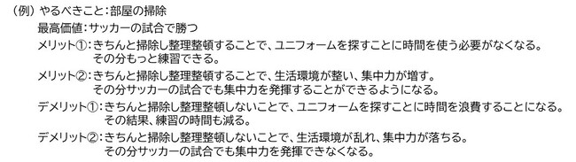 上記ワークで子供の価値の序列がわかったら、「やるべきこと」をすると子供にとっての最高価値にどんなメリットがあるのか、「やるべきこと」をしないと最高価値にどんなデメリット(※3)がもたらされるのかをそれぞれ20個以上書いてみましょう。