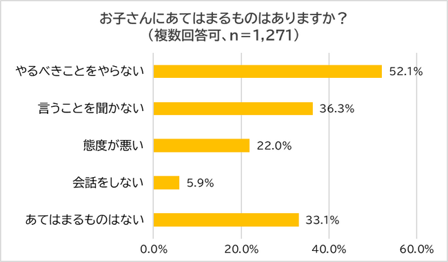 続いて、「小学生から高校生の子供にあてはまるものはあるか?」と尋ねたところ、最多は「やるべきことをやらない」(52.1%)、以下「言うことを聞かない」(36.3%)、「あてはまるものはない」(33.1%)となり、一定数の母親が子供の生活態度に難しさを感じていることがわかりました。