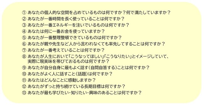 子供の「価値の序列」を知るために、子供に次の13の質問をして、それぞれ答えを3つずつ(ベスト3は何か?)出してもらったら、その答えに対して「それは何のためなのか?」も訊きましょう。このワークを子供と一緒にやることで、子供の価値の序列の最高位にあるものがわかります。