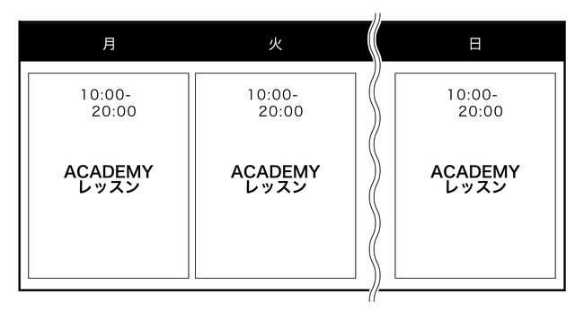 毎週日・月・火曜日の週3回、10~20時(休憩1時間)の計9時間/日のレッスンを半年間受講いただきます。